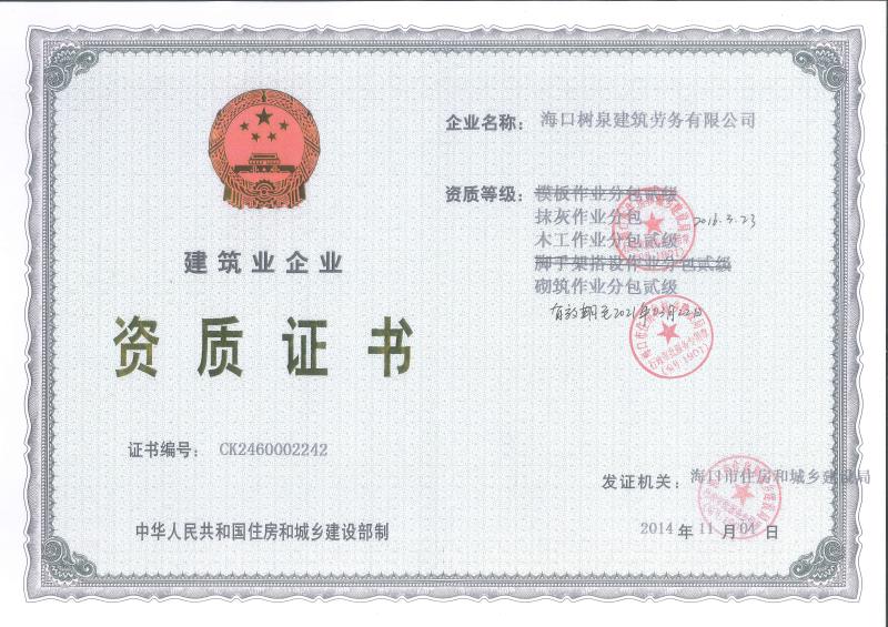 海口樹(shù)泉建筑勞務(wù)有限公司成立于2011年,公司位于海口,其前身是一家專(zhuān)業(yè)建筑施工隊(duì),自2004年即開(kāi)始在海南從事建筑勞務(wù)施工。自成立至今,公司已經(jīng)擁有一支科學(xué)管理、質(zhì)量過(guò)硬、能打硬仗,搶工期的專(zhuān)業(yè)隊(duì)伍。能獨(dú)立承擔(dān)大中型工業(yè)與民用建筑 、室內(nèi)外裝修、各類(lèi)機(jī)電設(shè)備安裝工程。代表工程有海口濱海華庭、三亞時(shí)代海岸T01/02/04/05棟高層、合肥東海花園二期、陵水富力灣B區(qū)高層、三亞金中海(酒店)、瓊海大印經(jīng)典花園、海口環(huán)球海景大酒店(四星級(jí)酒店,在建中)、陵水珍珠大廈(五星酒店)、海口萬(wàn)達(dá)廣場(chǎng)、美蘭機(jī)場(chǎng)二期。